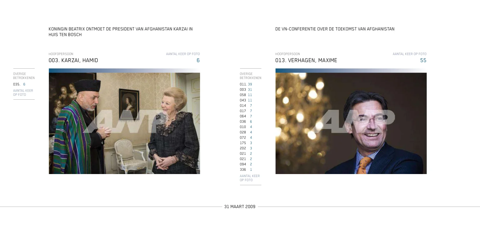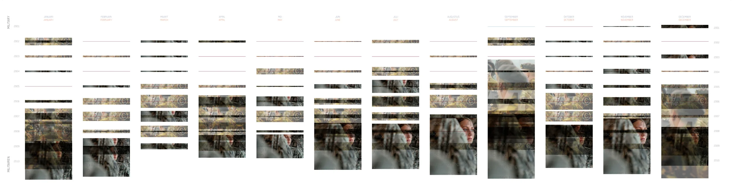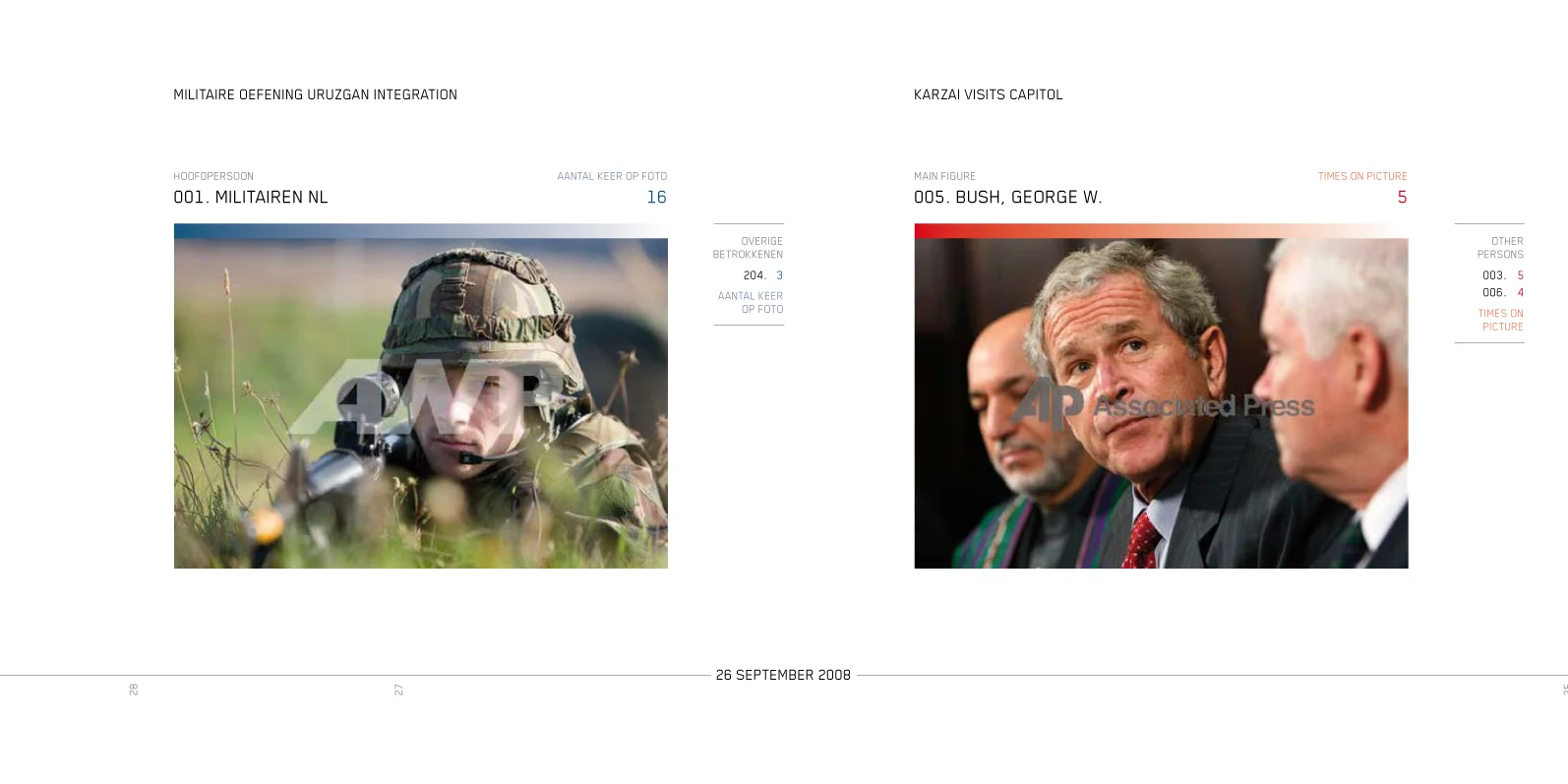 Om dit met elkaar te kunnen vergelijken ben ik twee persbureaus tegenover elkaar gaan zetten. Ik heb hierbij gekozen voor het Algemeen Nederlands Persbureau (ANP) en het Amerikaanse Associated Press (AP) . Omdat de totale beeldbank over de Afghanistan oorlog van het AP uit ruim 60.000 beelden bestaat ben ik begonnen met het op een rijtje zetten van een aantal belangrijke gebeurtenissen binnen deze oorlog. Hierbij kwam ik al snel uit bij de aanleiding voor deze oorlog, namelijk de aanslagen op het WTC van 11 September 2001. Hier stond de val van het Nederlandse kabinet in de nacht van 19 op 20 februari 2010 tegenover. Je zou dus kunnen zeggen dat ons kabinet gevallen is door de aanslagen van 11 September. Daarnaast valt natuurlijk meteen op dat een aantal belangrijke gebeurtenissen niet voor elk perspectief even belangrijk waren. Een Nederlandse soldaat die overlijd en hier groot in het nieuws komt wordt in de Amerikaanse pers waarschijnlijk niet eens genoemd. Maar hoe zit dit met de rest van de berichten. Waar zitten de pieken en de dalen in de berichtgeving bij de verschillende persbureaus en waar overlappen deze elkaar? Elk persbureau heeft natuurlijk andere prioriteiten en stuurt zijn correspondenten daarom naar andere gebieden.